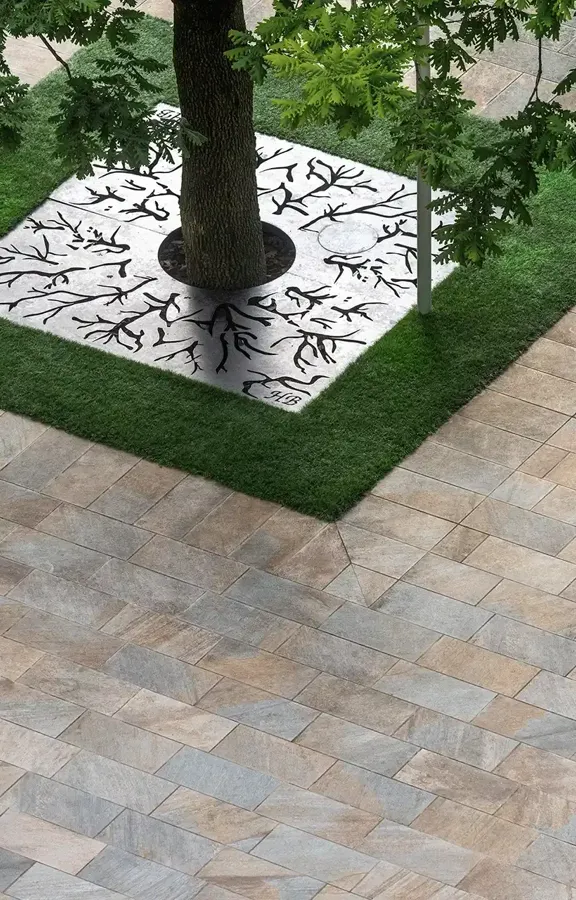 Der Steineffekt ist seit jeher der große Favorit für Außenverkleidungen. Im Falle dieses Projekts sind die Gehwege im Hotelpark mit Limes Quartz Multicolor-Keramikplatten im Format 30x60 cm verkleidet. Die Rostpinselstriche mischen sich mit Anthrazitgrau und schaffen eine sehr angenehme Bewegung, die sich perfekt in die Landschaft einfügt.