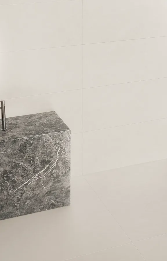 Inspirada en las grandes metrópolis internacionales y caracterizada por una superficie mate, esta serie puede definirse como gres porcelánico imitación resina de estilo minimalista.
