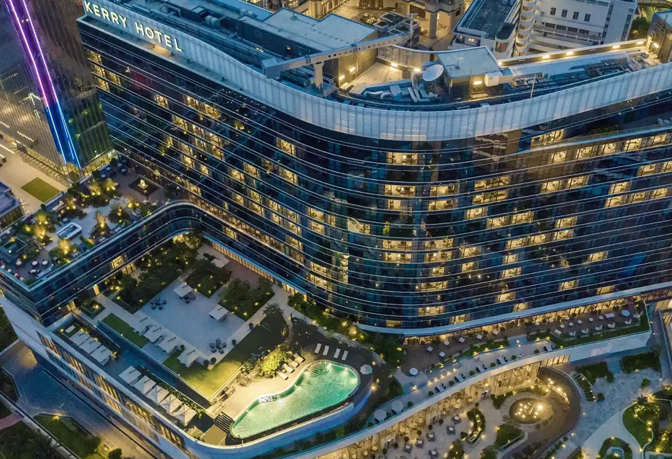 El Hotel Kerry de la cadena Shangri-La se asoma a la bahía de Hong Kong. Creado por el diseñador André Fu, desde sus 546 habitaciones y sus terrazas ofrece una vista impresionante de la metrópolis.