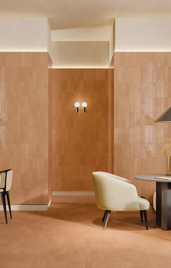Parmi les tendances de 2026, les configurations horizontales de style métro continuent d'être privilégiées pour leur attrait traditionnel et leur capacité à amplifier visuellement les espaces, tandis que les poses en chevron sont appréciées pour leur dynamisme géométrique et leur caractère artisanal. Les carreaux grand format sont connus pour leur esthétique minimaliste et l'effet de continuité visuelle qu'ils sont en mesure de créer. La pose verticale de carreaux de style métro constitue une alternative très intéressante pour ceux qui souhaitent souligner la hauteur de leurs plafonds, tout en conservant le rythme du matériau et l'immédiateté expressive propres à ce format.
