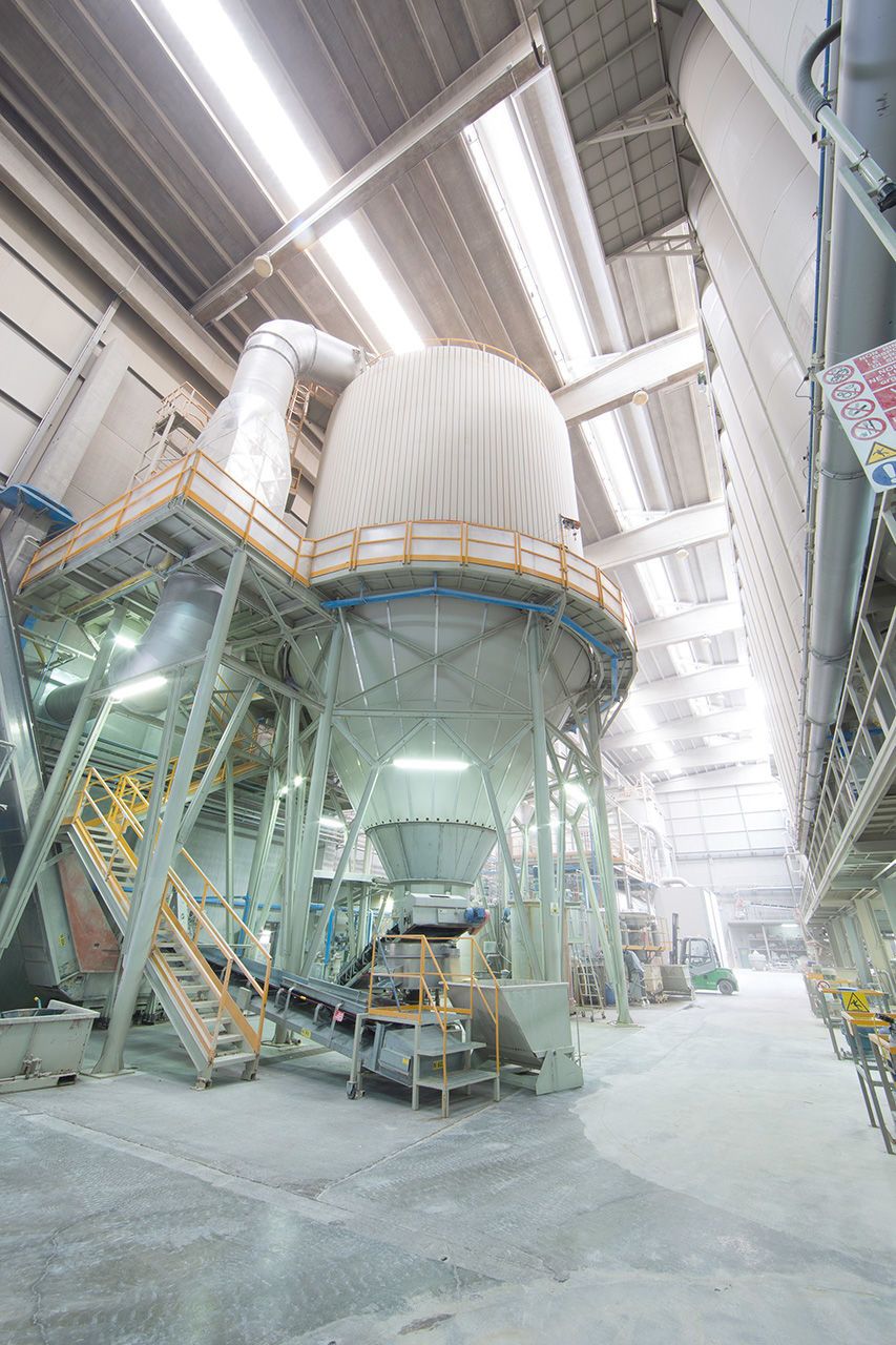 Подготовка смеси выполняется в результате процесса размола и последующей атомизации. Сырьевая смесь подвергается влажному размолу во вращающихся мельницах непрерывного действия вплоть до получения жидкости (шликера), которая собирается в специальные подземные ванны, оборудованные смесителями. Именно на данном этапе рождаются изысканные цветовые сочетания, характеризующие продукцию KEOPE. Шликер окрашивается по всей массе при помощи натуральных красителей, которые также прошли влажный размол. Цветная жидкость закачивается насосами и подается под высоким давлением в атомизатор, который создает однородный и очень тонкий порошок, готовый для прессования.